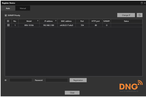 - Sau khi chọn, một màn hình mới hiện lên, ban đầu phần mềm sẽ để TAB Auto vào quét thiết bị trong cùng một hệ thống mạng với máy tính, nếu bạn muốn kết nối qua IP, vui lòng chọn thiết bị và điền ID và Password sau đó ấn Registration