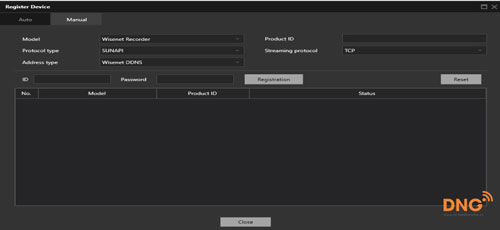 - Nếu bạn đã có Wisenet DDNS bạn hãy vào Manual với Address type chọn Wisenet DDNS, Product ID là tên DDNS của bạn, sau đó nhập ID: tên tài khoản của bạn, Password: Mật khẩu của bạn sau đó ấn Registration và Close