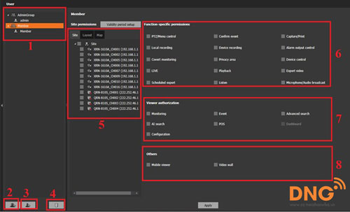 + PTZ/Menu Control: Quyền truy cập các chức năng PTZ.