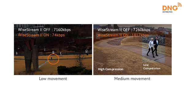 Như các bạn đã biết, chất lượng hình ảnh càng cao và đặc biệt góc nhìn càng lớn thì dữ liệu lưu trữ sẽ càng nặng. Điều này sẽ được khắc phục bởi công nghệ nén WiseStream II độc quyền đến từ Hanwha Techwin, khi kết hợp với tính năng nén H.265, dữ liệu tốc độ bit sẽ giảm tới 99% so với công nghệ H.264 hiện tại. Chi phí cấu hình và bảo trì hệ thống cũng được giảm đáng kể, trong khi vẫn giữ nguyên pixel và chất lượng hình ảnh.