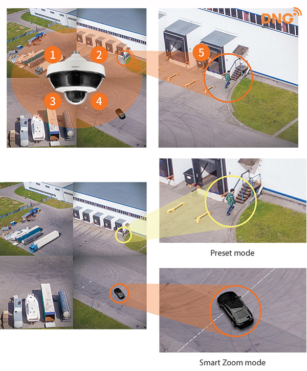 Khi camera đa hướng phát hiện một sự kiện, nó sẽ tự động liên kết với camera PTZ để thực hiện các chức năng phóng to và theo dõi. Khi sử dụng chế độ đặt trước, camera PNM-9322VQP với camera PTZ phóng to đến vị trí mà người dùng đặt trước, trong khi chế độ thu phóng thông minh tự động phóng to vào khu vực phát hiện sự kiện.