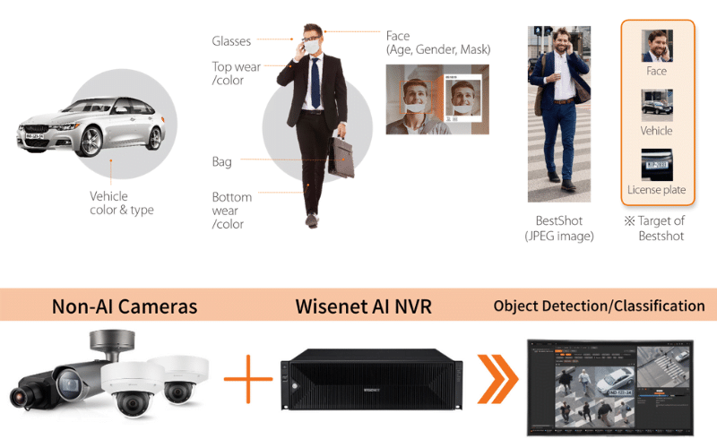 Camera AI của Wisenet được thiết kế để theo dõi chính xác các thuộc tính độc đáo của các vật thể như mặt và biển số xe, trong khi giảm cảnh báo sai do vẫy cây, tiếng ồn video, và thậm chí bóng tối. Đội hình Wisenet AI NVR là NVR Wisenet đầu tiên có tính năng AI. Điều này cung cấp khả năng giám sát và sao lưu video theo thời gian thực với độ phân giải lên tới 8K và nâng cao hơn nữa sự tiện lợi của người dùng thông qua GUI trực quan mới.