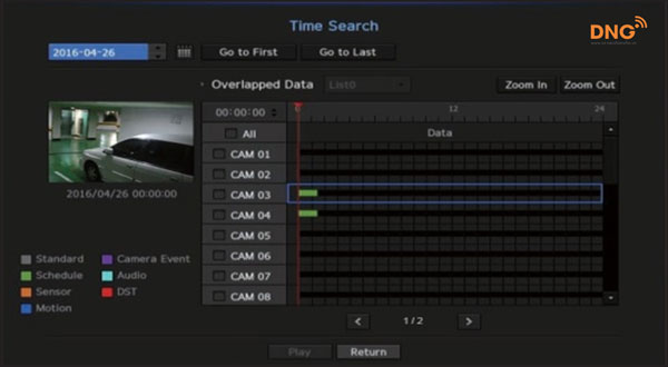 Bạn có thể tìm kiếm dữ liệu được ghi lại trong một khoảng thời gian mong muốn. Thời gian hiển thị được dựa trên múi giờ địa phương và thời gian letding saving (DST). Do đó, dữ liệu được ghi lại đồng thời từ các khu vực khác nhau có thể khác nhau dựa trên múi giờ và thời gian DST.