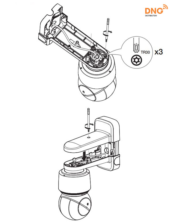 Ở trên phần đầu của camera sẽ có bộ phận dành cho việc treo và gắn camera với chân đế đi kèm. Bạn kiểm tra phụ kiện đi kèm với sản phẩm camera PTZ và tìm kiếm loại thiết bị như hình, sau đó tiến hành theo các bước sau.