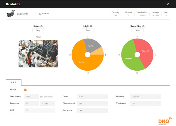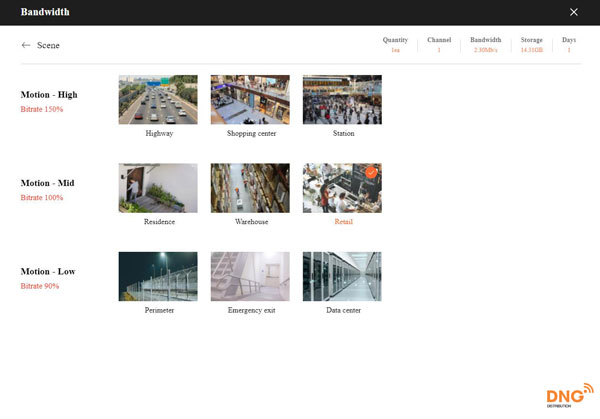 + Scene Setup: Nơi lắp đặt có nhiều chuyển động sẽ tiêu tốn nhiều dung lượng hơn. Các camera được lắp đặt ở vị trí như “Highway” sẽ tốn nhiều dung lượng hơn gấp 5 lần các camera được lắp đặt ở các “Data Center” tùy chỉnh này là cực kỳ quan trọng để đưa ra tính toán chính xác.