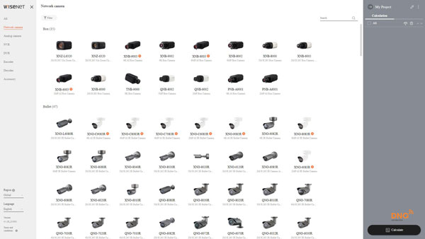 Giao diện công cụ tính dung lượng lưu trữ camera của Wisenet