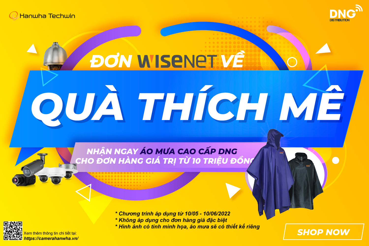 Tháng 5 này tại DNG, TẶNG NGAY 1 ÁO MƯA CAO CÁP cho dịp các đơn hàng Wisenet Hanwha Techwin giá trị từ 10 triệu đồng trở lên.